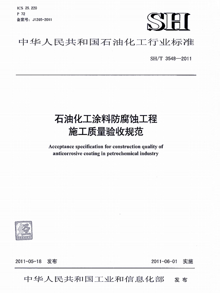 石油化工涂料防腐蝕工程施工施工質量驗收規范標準SH/T 3548-2011 ICS25.220 P72 備案號:J1265-2011 SH 中華人民共和國石油化工行業標準 SH/T 3548-2011石油化工涂料防腐蝕工程施工施工質量驗收規范 Acceptance spccificatinon for construction quality of anticorrosive coating in